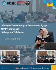 Kabupaten Pelalawan telah melaksanakan penyusunan Renja OPD Tahun 2025 pada Kamis, 04/04/2024, bertempat di kantor Bappeda Kabupaten Pelalawan. Dalam hal ini BPMP Provinsi Riau melaksanakan tugasnya dalam mengadvokasi pendampingan Penyusunan Renja OPD Tahun 2025 Kabupaten Pelalawan. Dr. Nilam Suri bersama dengan tim disambut langsung oleh Kaban Bappeda Kabupaten Pelalawan, Zulkifli, S.Ag., M. Si., pada kesempatan ini turut hadir Asisten II Pemerintah dan Kesra Setda Kabupaten Pelalawan, jajaran Kabid Dinas Pendidikan Kabupaten Pelalawan.