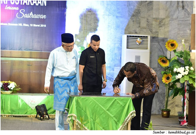 Pekanbaru – (21/03/2016) ~ Warga Provinsi Riau patut berbangga, karena Provinsi Riau dicanangkan sebagai Provinsi Literasi oleh Menteri Pendidikan dan Kebudayaan, Anies Baswedan, pada hari Jumat (18/03/2016). Pencanangan sebagai Provinsi Literasi tidak terlepas dari upaya Pemerintah Provinsi Riau untuk selalu meningkatkan pelayanan pada perpustakaan baik pada perpustakaan daerah,perpustakaan sekolah dan universitas, maupun pada taman bacaan yang ada di lingkungan masyarakat. Salah …